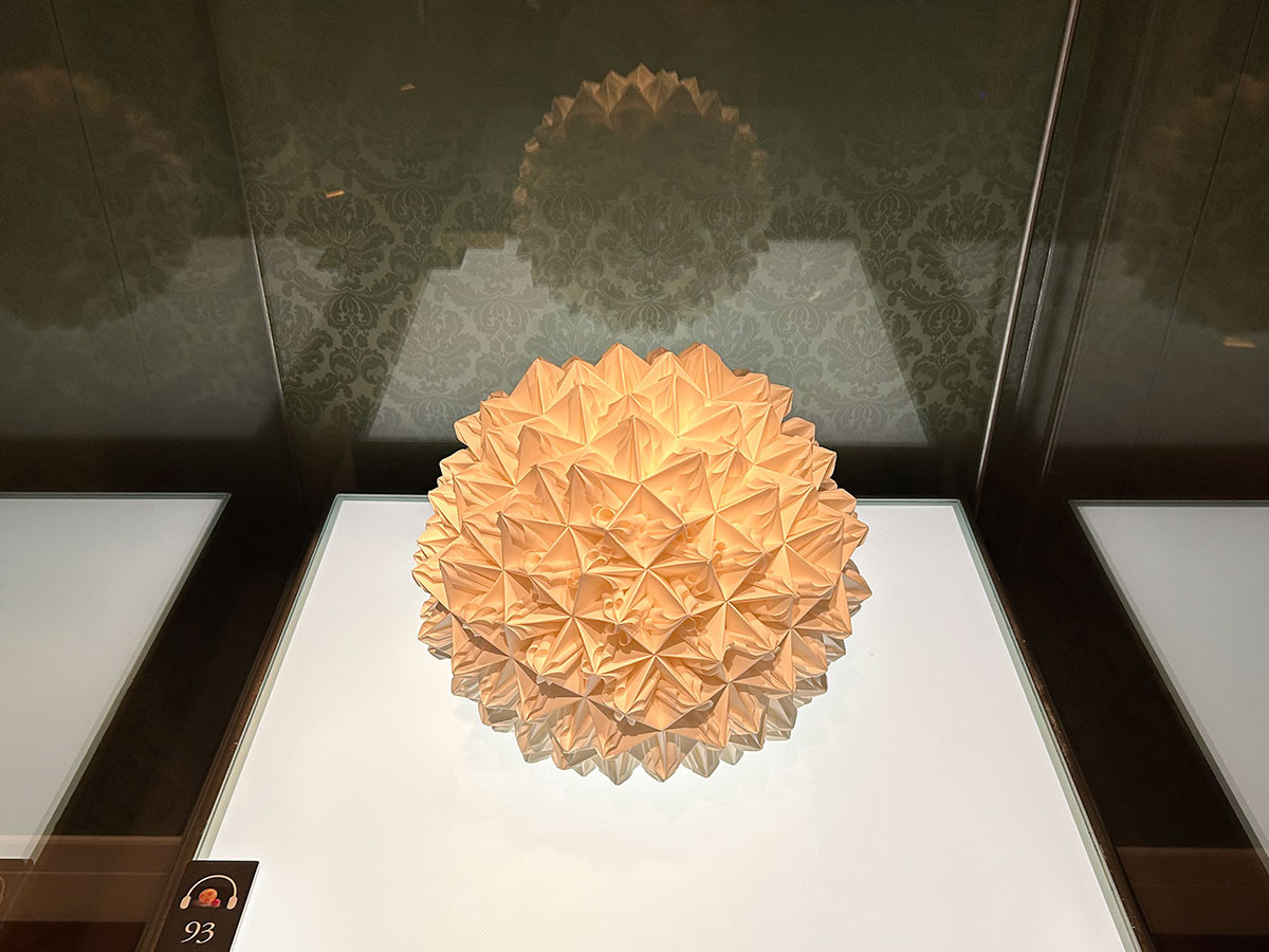 ガラスケースの一番右側に置かれた青緑色と黄色の《正方形・星組専用ユニット》には、なんと1080枚もの紙のパーツ(ユニット)が使われています。これらの作品も、切ったり、貼ったりせず、一枚の紙を折って作ったパーツを組み合わせて制作されています。そのため、作品を運ぶために、そーっと持ち上げたとき、接着されていないパーツ同士がこすれて、かすかに音がしたそうです。