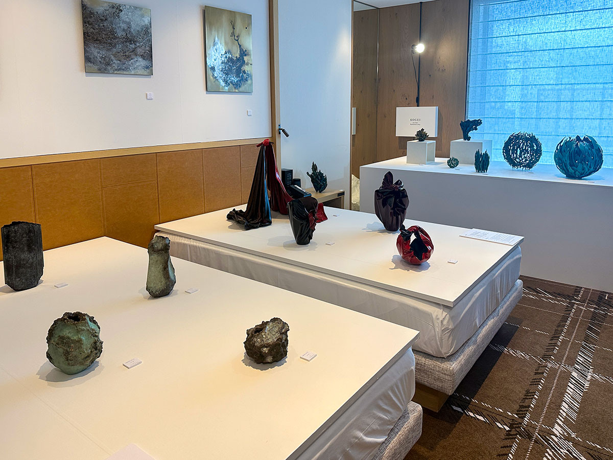 今回のアートフェアでは、金沢のほかに、東京、岐阜、京都、大阪など13の地域のギャラリーが出展。ホテルの部屋を活かしてベッドやテーブル、バスルームに並んだ作品を、各ギャラリーの部屋毎に楽しむことができます。