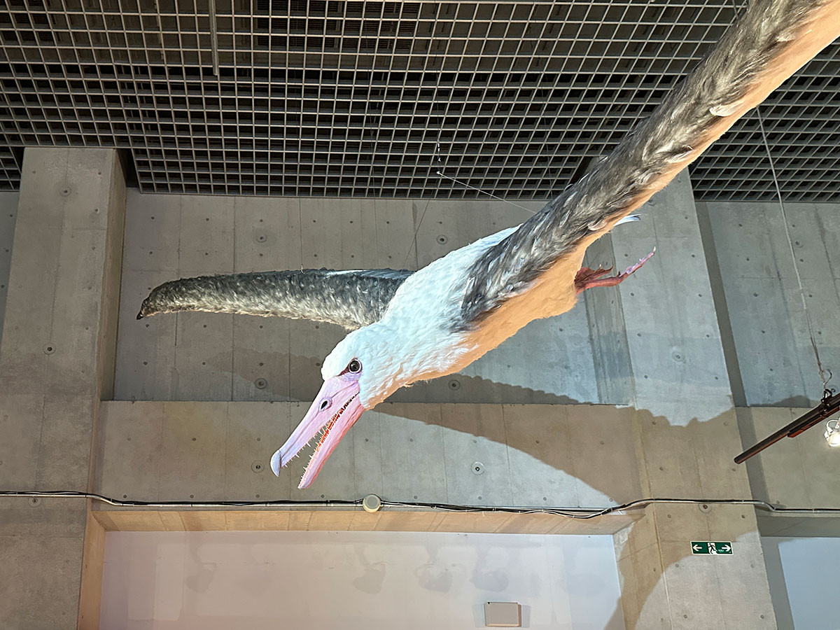 天井から現れるのは、およそ2600万年前に生きていた「ペラゴルニス・サンデルシ」。史上最大の飛べる鳥といわれた、翼開長7mもの大きさを実物大生体モデルで復元しています。