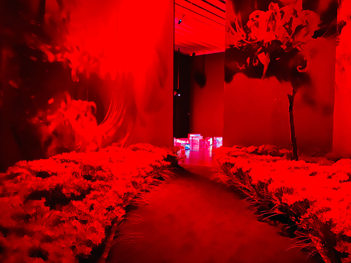 本展覧会のハイライトとなる深淵。色鮮やかな造花が咲き乱れる花園とその先の天地が抜け落ちるような奈落とで構成されていて、天上の世界のようでもあり、黄泉の奥底のようでもあり、圧倒的な質量にたじろぎ共鳴します。まさに異界めぐりのクライマックスでした。