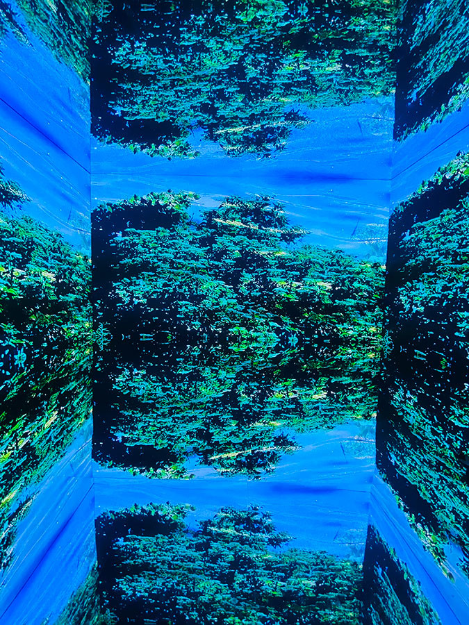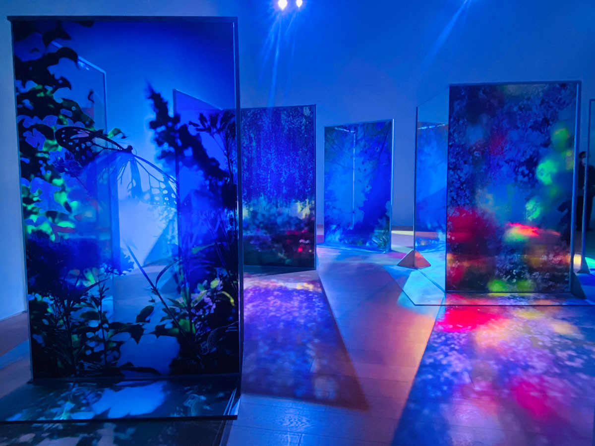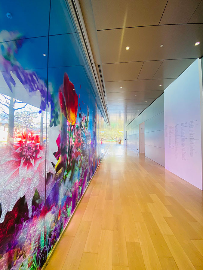 人の背丈ほどの大きなガラスパネルが花畑、蝶、藤、桜、海中の光景へと展開していく中に入り込んだ自分自身を眺めている私。床に映る光と色も柔らかくてほっとする空間です。