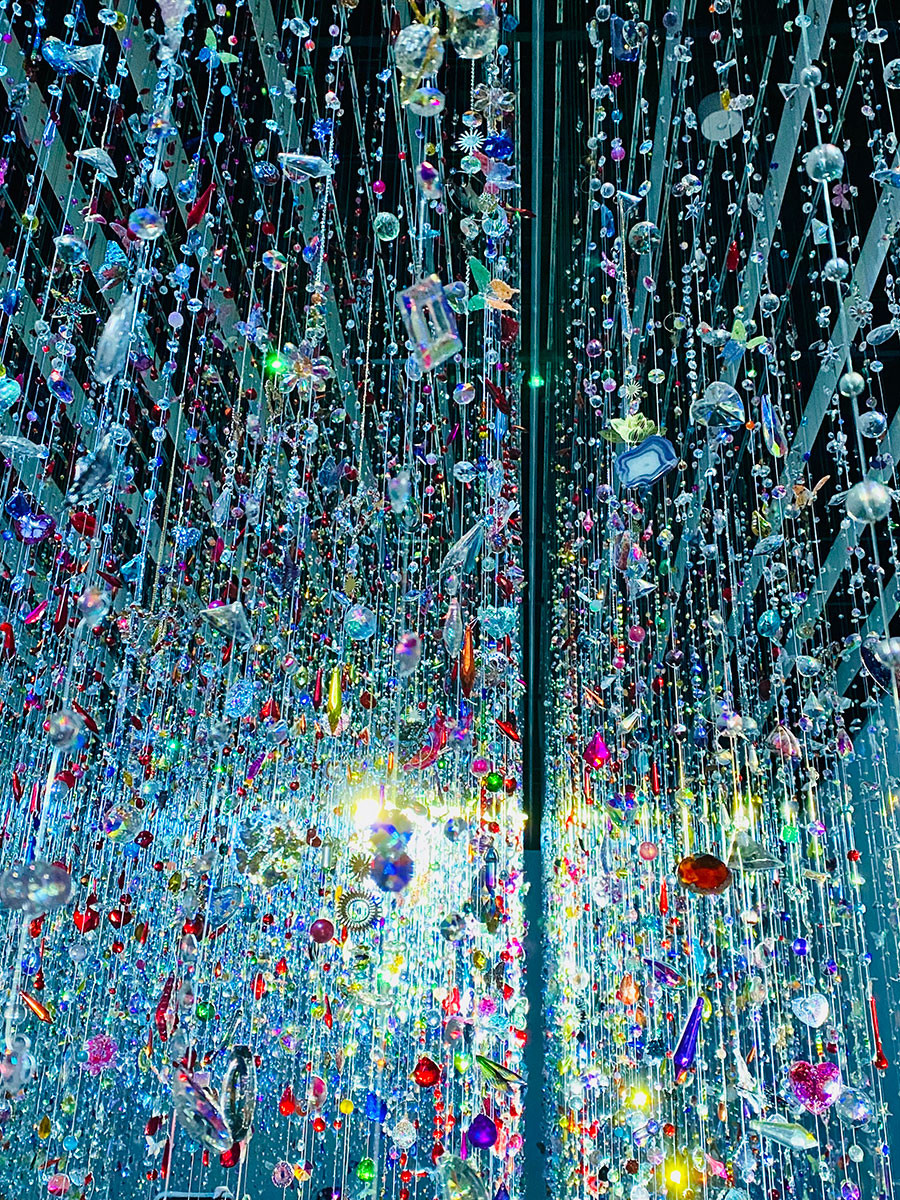 天井から降り注ぐ1,500本のクリスタルガーランドは、光を帯びてきらめく色彩のシャワーに見える幻想的な空間。よく見るとガーランドにはクリスタル、サンキャッチャー、蝶、星、ハート、目玉など沢山のパーツがキラキラと…。その数10万個、一本一本デザインを決めて手仕事で繋ぎに繋いだ壮大なスケール感は圧巻。息を呑むほどほど美しい。