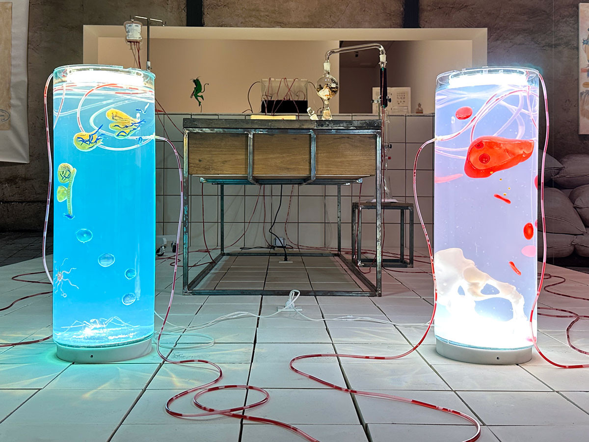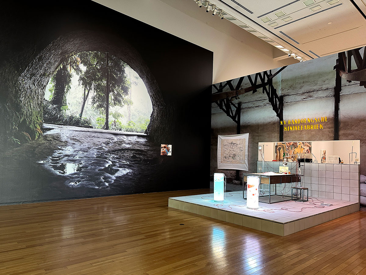 新作のインスタレーション《Bandoengsche Kininefabriek》は、バンドンで行われたマラリアの特効薬のキナの栽培の歴史をたどる作品です。蚊に刺されることで感染する熱帯地域でみられるマラリアの、人間と蚊の体内を行き来する様子が表現されています。