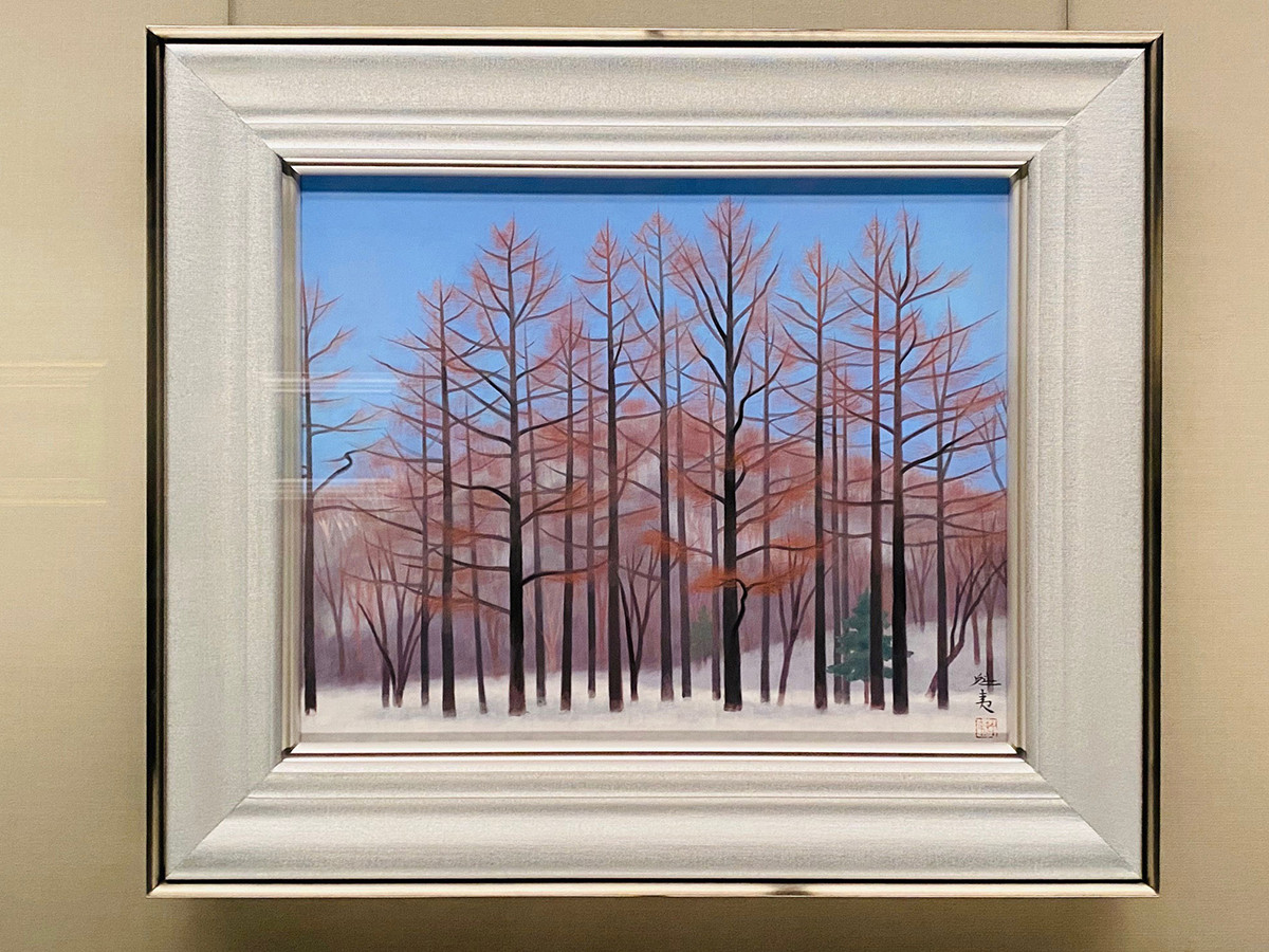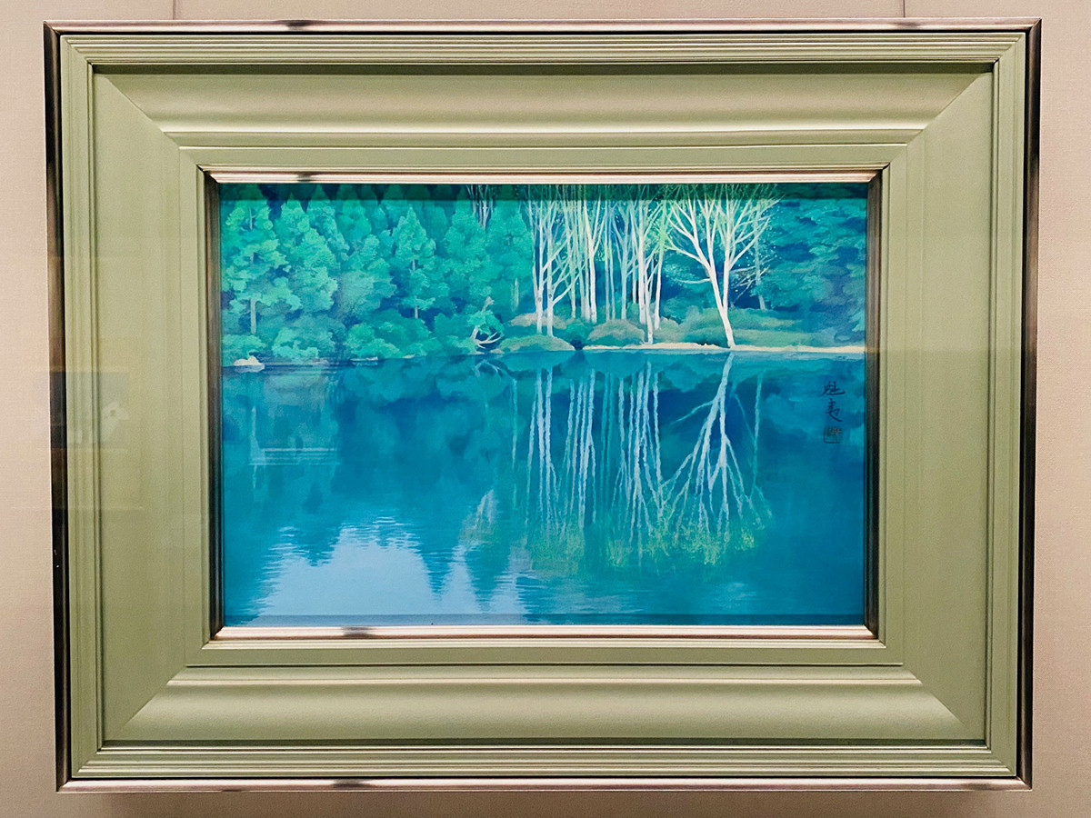 透明度が高い長野県志賀高原にある三角池を題材にした作品。青を基調とした顔料を塗り重ねて細やかなタッチで水のゆらめきが表現されています。白い馬を探してしまいました。
