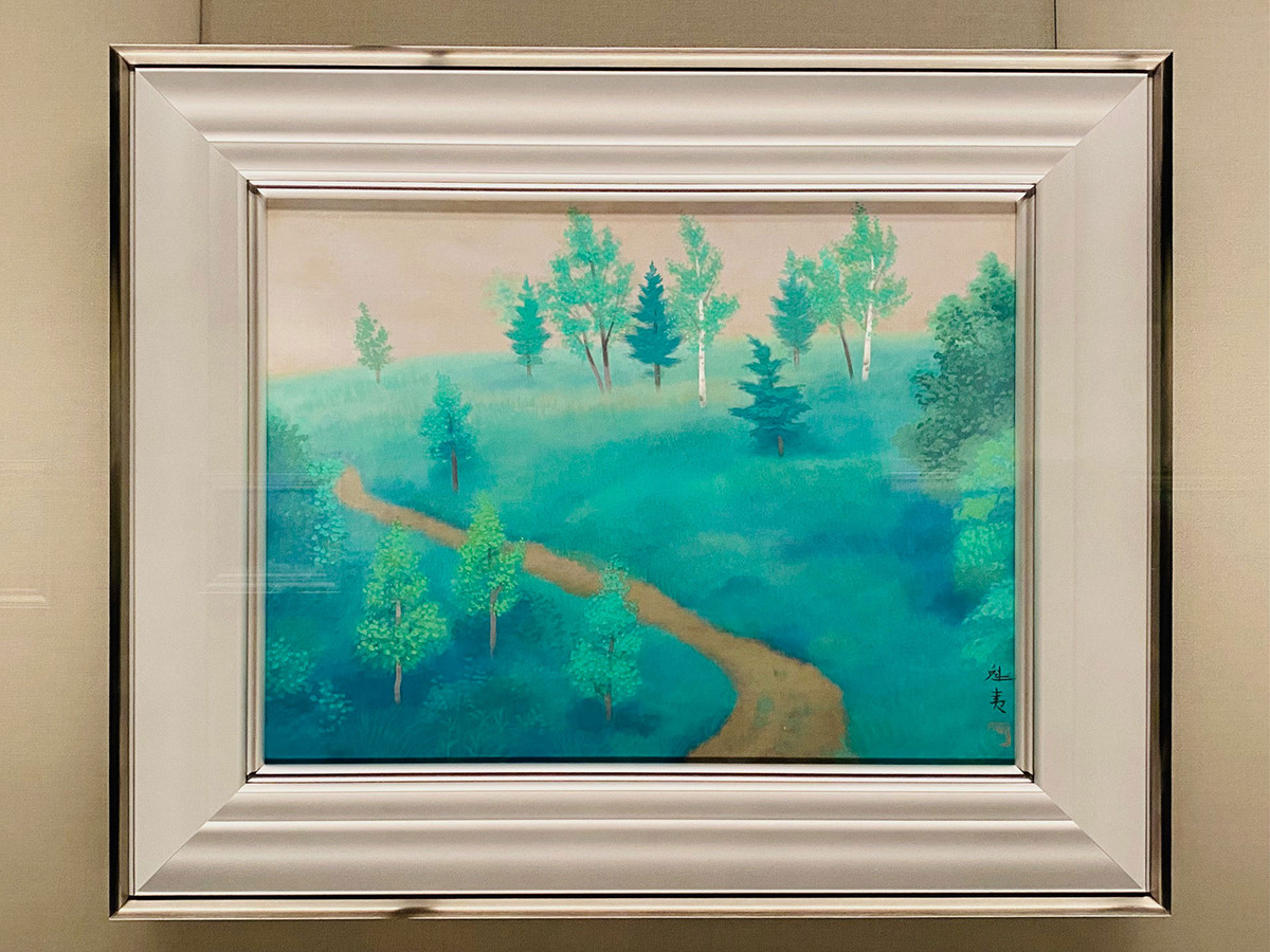 第3章「東山魁夷と同時代のカラリスト」では、魁夷の集大成ともいえる円熟の境地を示す二作品が展示されています。晩年の作品となる《緑の朝》の画面右側には、「白馬シリーズ」で登場する馬の姿を消した形跡がうっすらと残っているのが確認できます。注目ポイントです。