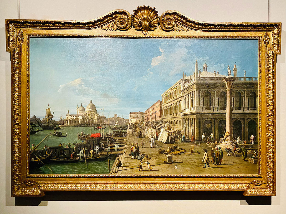 当時、この眺めは人気があり、カナレットも気に入って何点も描いています。ガイドブックにできそうな精密さで描かれていますが、実はこの場所付近にある名所を一望できるように複数の眺めを組み合わせた工夫に満ちた作品です。