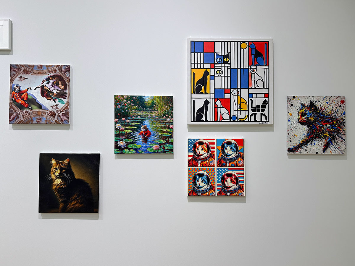 「BIG CAT BANG」は、岡本太郎が1970年の日本万国博覧会で作った太陽の塔をオマージュした作品で、宇宙船LUCA号に乗船した宇宙猫が無数に飛び散る爆発の瞬間を描いています。この物語の絵は、AIを使用して画像生成によって生まれました。