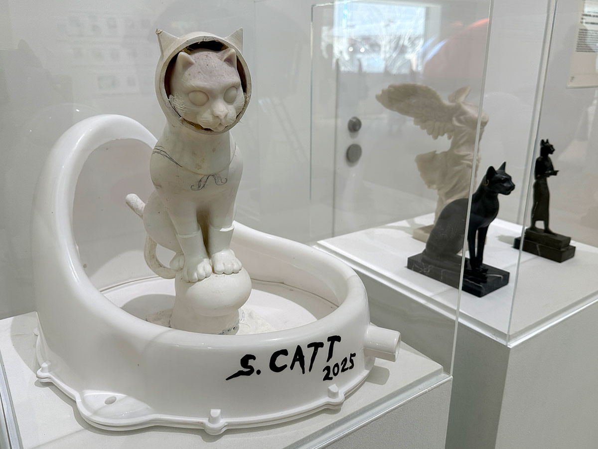 ヤノベケンジは1965年、大阪生まれ。1990年代初頭から、ユーモラスな形態に社会的メッセージを込めた大型機械彫刻を制作し、国内外で高い評価を得ています。2017年から制作している船乗り猫をモチーフにした旅の守り神「SHIP’S CAT」シリーズは、大阪中之島美術館の恒久展示や、GINZA SIXの吹き抜け空間での「BIG CAT BANG」展示でも話題を呼びました。