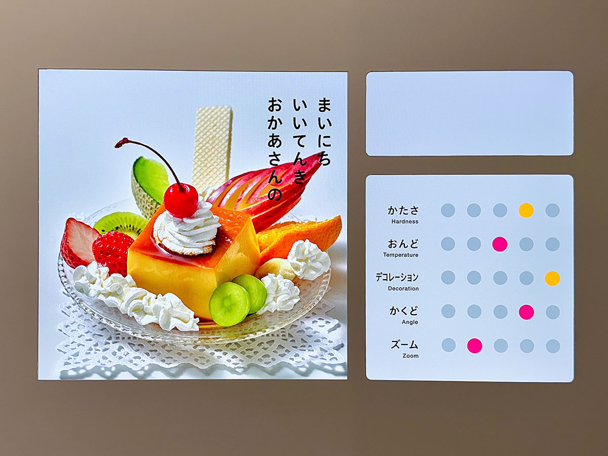 お箸やフォーク、スプーンや手で“たべる”を表現している「ひとくち あーん」。つまむ、すくう、にぎる、ちぎる、など人が食べる際に行う動作を思い起こさせます。隣に並んでいるのは、触感をあらわすオノマトペのピースを食べ物のフォーマットに当てはめる「オノマトピース」です。