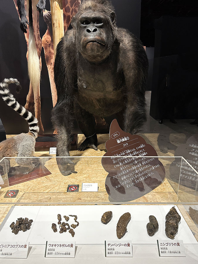会場に並ぶ動物たちの下に目線を向けると、それぞれのうんちが展示してあります。動物によって、大きさや形がさまざまなことが分かります。