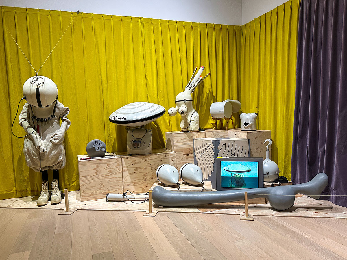 イラストと一緒につまらない顔をする顔出しパネルや口うるさい大人にリンゴを投げて黙らせる展示、トゲトゲした座りにくい椅子など、絵本になぞらえたポップでシュールな作品も並んでいます。