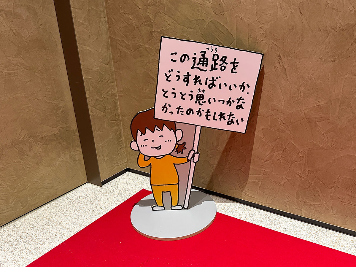 ヨシタケさんのこだわりは、イラストや体験コーナーだけでなく、会場の隅々に隠れています。 例えば、会場に貼られた黄色の付箋は、開催直前に自身が書いたもので、それぞれの会場でしか味わうことができないものです。