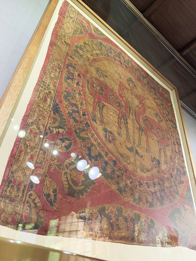 シルクロード・ミュージアムを代表するコレクションが、ガンダーラから出土した《弥勒菩薩立像》。ギリシア彫刻の影響を受けたガンダーラ様式で、装身具やサンダルをまとい、髷を結った気品ある姿が印象的です。