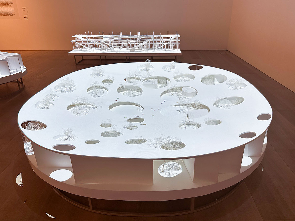 「たくさんの ひとつの 森」では、2024年にコンペで選出され、藤本が基本設計を手がけている音楽ホール兼震災メモリアル《仙台市(仮称)国際センター駅北地区複合施設》を紹介しています。「たくさんの/ひとつの響き」をテーマとするこの建物は、15分の1スケールの大型吊り模型によって、その構造を体感することができます。