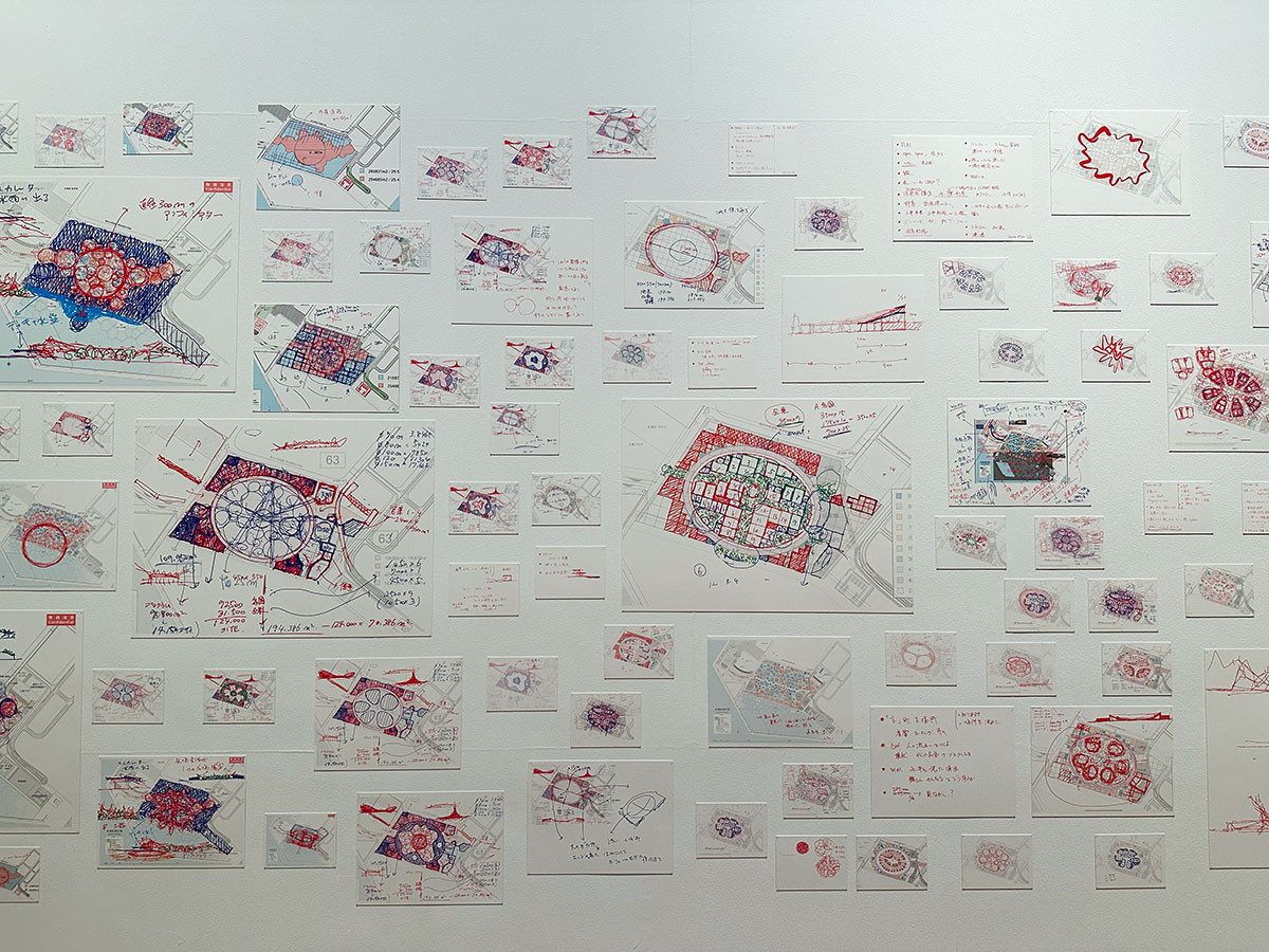 高さ約20メートル、幅約30メートル、全長およそ2キロにおよぶリングは、会場では約5分の1のサイズに縮小して展示されています。さらに、藤本が構想段階で描いたスケッチや記録写真、設計図面のほか、リングで用いられている貫接合技術を紹介するモックアップやインタビュー映像も展示され、リングの構造や思想を多角的に掘り下げています。