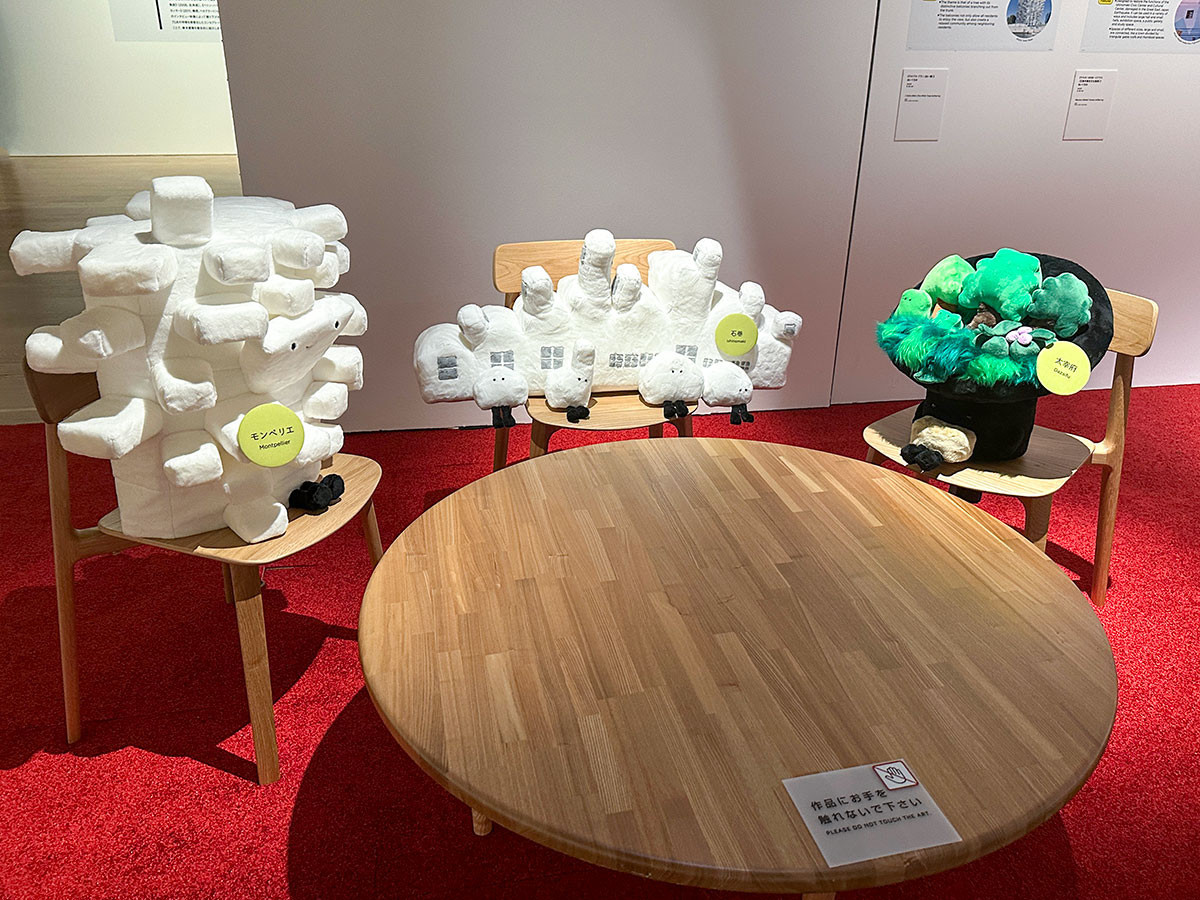「ぬいぐるみたちの森のざわめき」では、藤本が手がけた9つの建築作品が、ぬいぐるみとなって登場します。《ラルブル・ブラン(白い樹)》や《太宰府天満宮 仮殿》など、各プロジェクトの特徴や設計の背景について、ぬいぐるみたちがテーブルを囲んで対話するインスタレーションです。