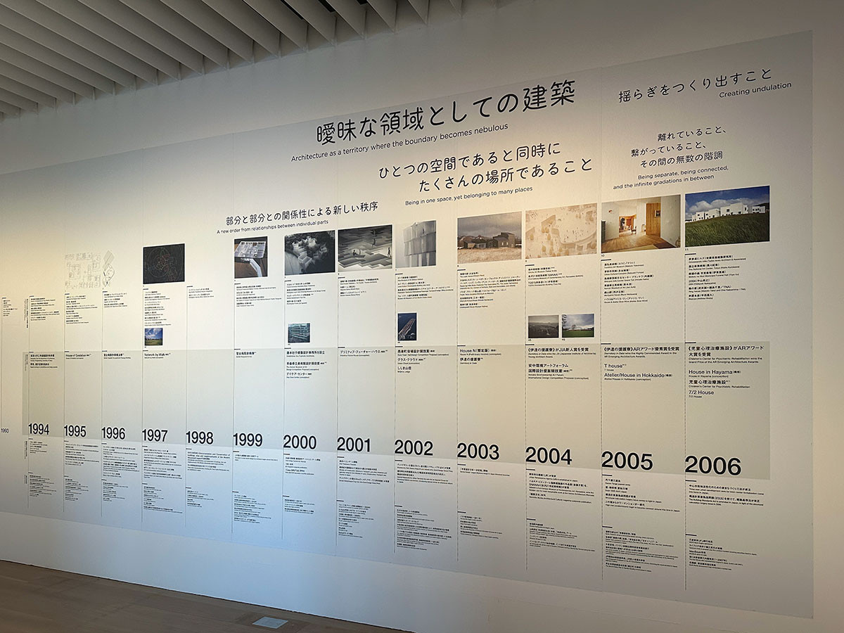 2つめのセクションでは、藤本が東京大学を卒業した1994年以降の活動を年表で振り返ります。藤本の活動のほか、国内外の建築家の主要な作品や動向、藤本が影響を受けた建築作品を取り上げ、藤本建築の歴史的文脈を読み解くことができます。