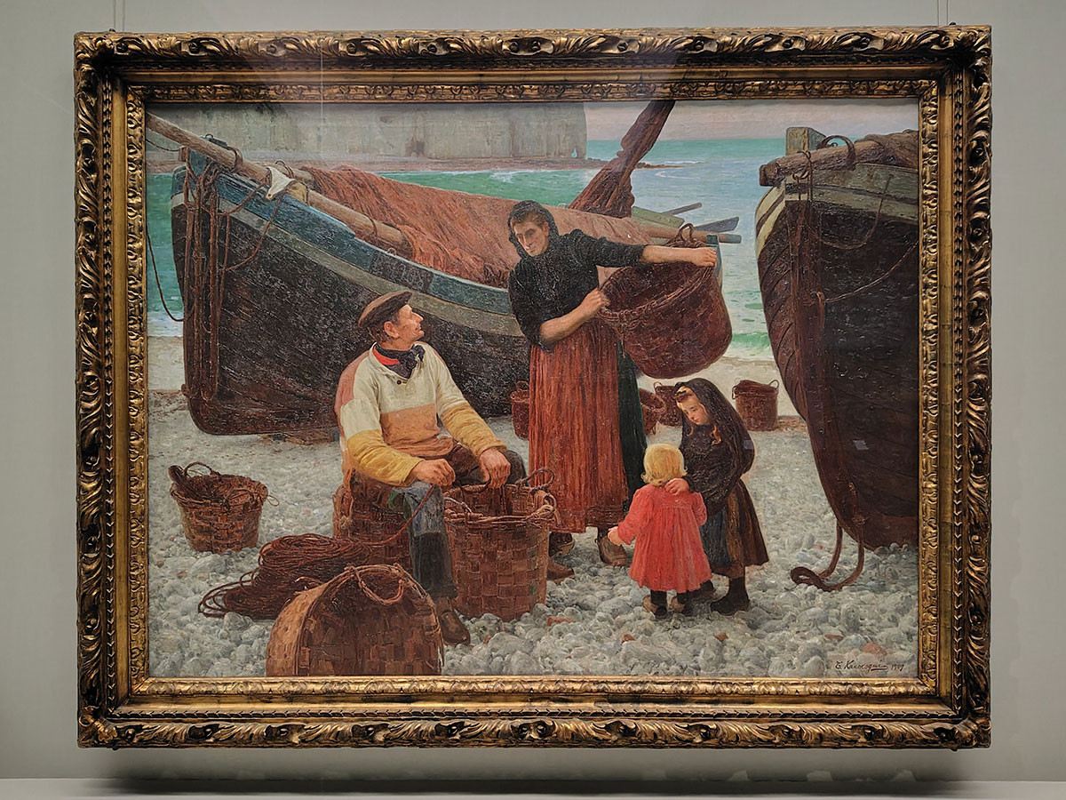 ノルマンディーの漁師の家に身を置き、潮風と暮らしの音に耳を澄ませながら、鹿子木孟郎はこの絵を描き上げた。 画面からは、人物の佇まいだけでなく、浜辺の石のゴツゴツとした感触が“その場にいる”という感覚を、脳に直接語りかけてくるようだ。