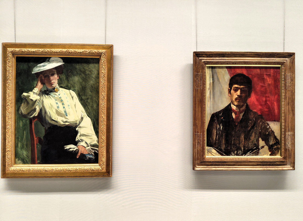 左:鹿子木孟郎《白衣の婦人》1901–03年頃(明治34–36)京都工芸繊維大学美術工芸資料館蔵[前期展示]、右:鹿子木孟郎《自画像》1903年頃(明治36)個人蔵