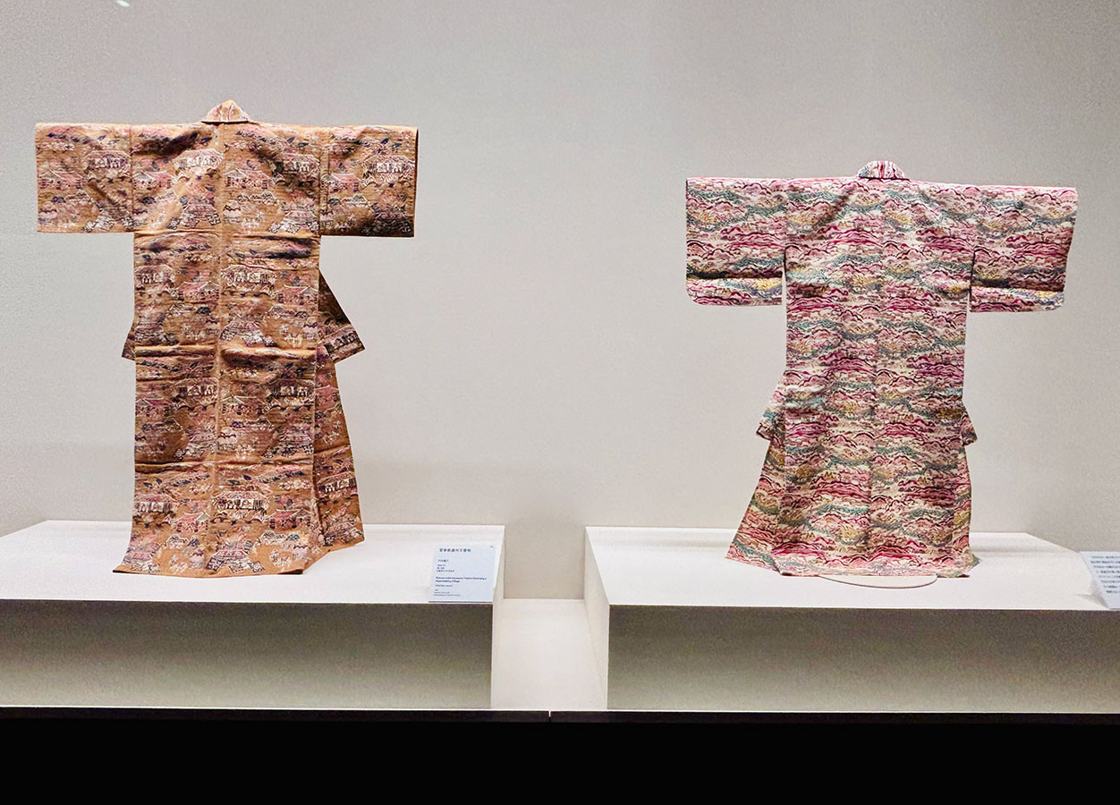 芹沢銈介 左《型染壺屋風物文着物》、右《型染紙漉村文着物》 いずれも1968年 京都国立近代美術館【前期展示:10/26まで】
