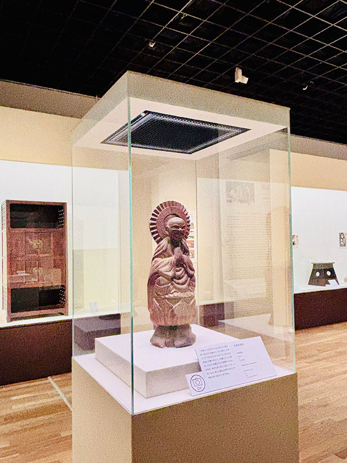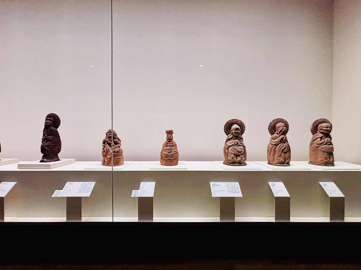 特別展「民藝誕生100年ー京都が紡いだ日常の美」展示風景 手前:木喰上人《地蔵菩薩像》1801年 日本民藝館蔵