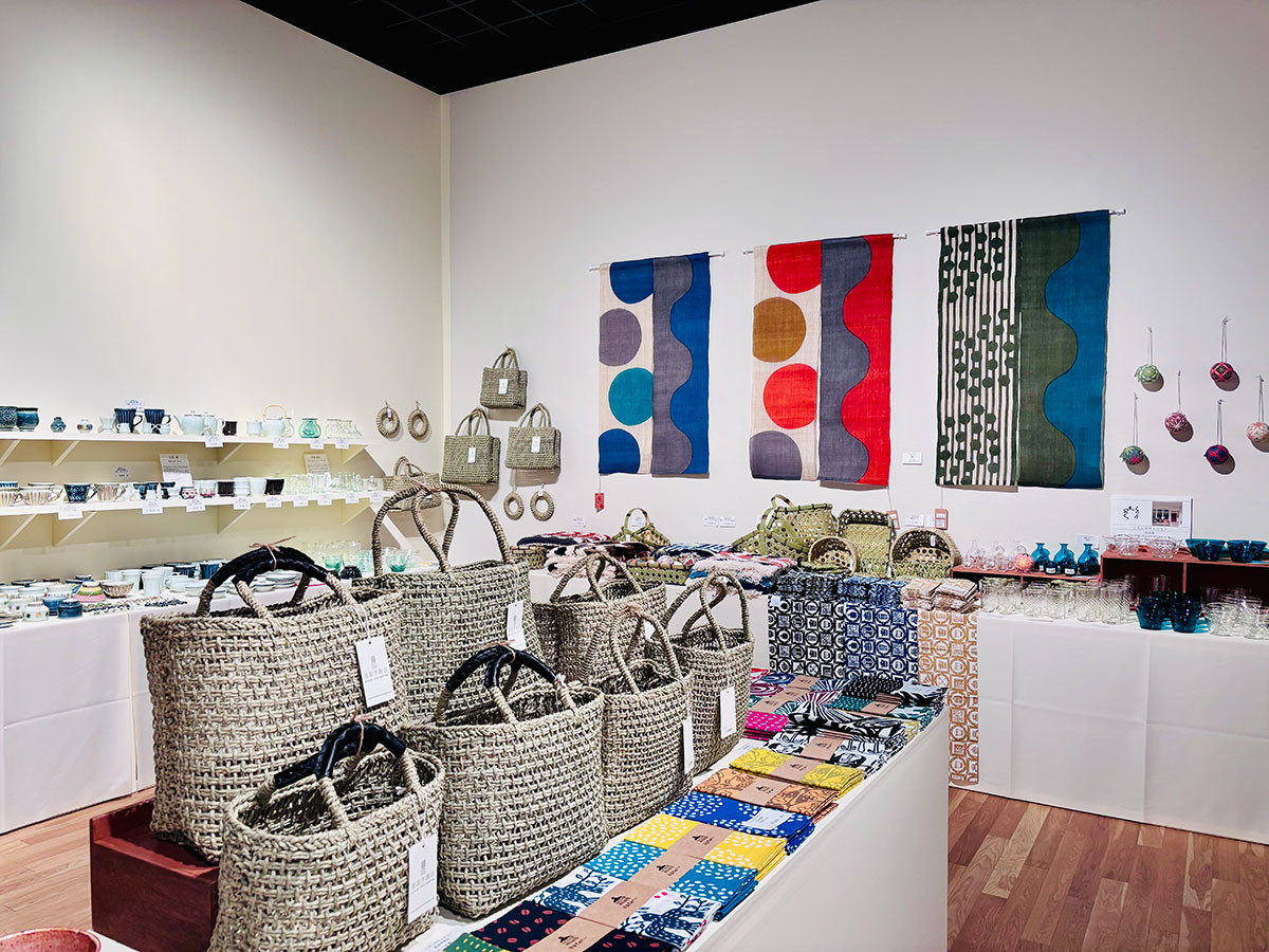 さて、特設ショップでは、人気染色家・石北有美さんによる限定デザインの手ぬぐいはじめ、展覧会オリジナルグッズ、器やかごバッグなど各地の民藝品も充実していて、お買い物も存分に楽しめます。