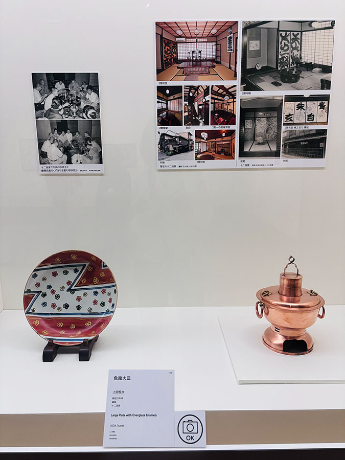 左:上田恒次《色絵大皿》1980、右:現在も使われる銅製の火鍋子(西垣光温のデザイン) 十二段家