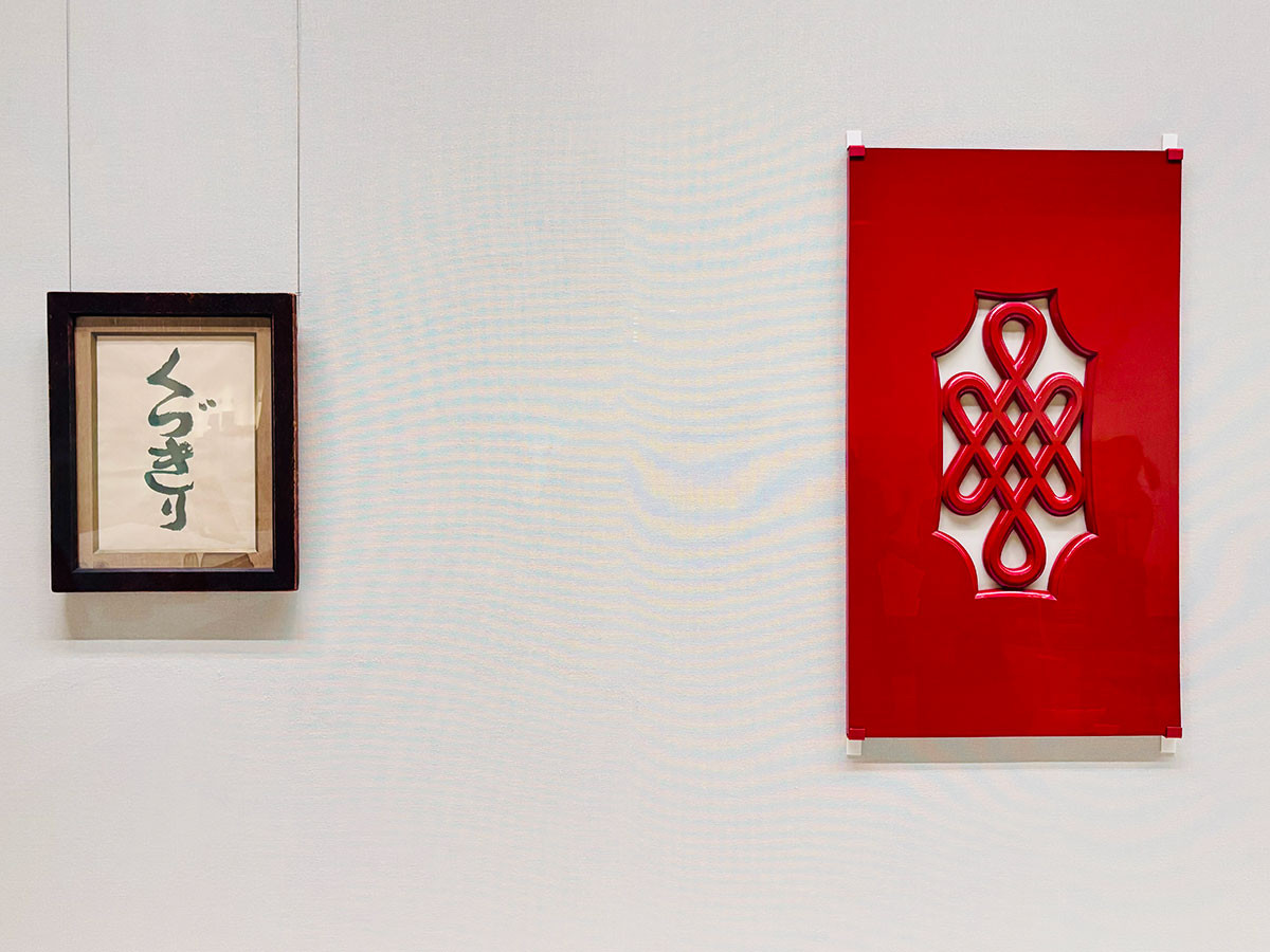 、書「くづきり」1956年、黒田辰秋《赤漆宝結文飾板》1932-1935年 いずれも鍵善良房