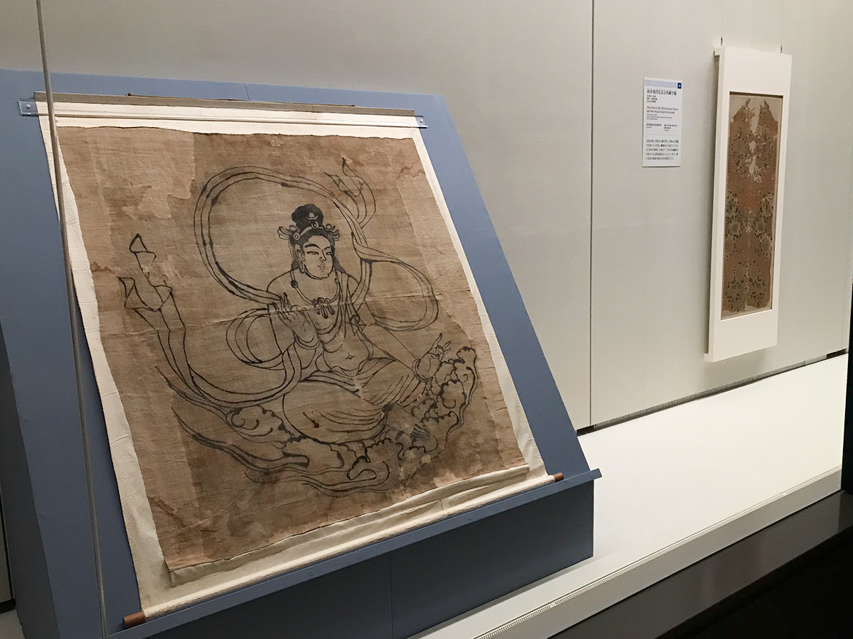 (左から)正倉院宝物《墨画仏像》奈良時代・8世紀 正倉院 / 《淡赤地団花鳥文夾纈平絹》奈良時代・8世紀 東京国立博物館[ともに前期展示:10/14~11/4]