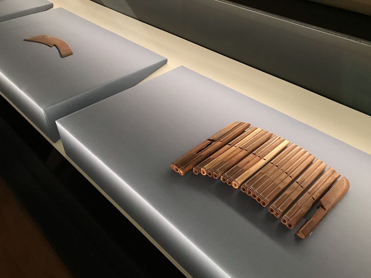 (左奥から)正倉院宝物《楸木帯》奈良時代・8世紀 正倉院 / 正倉院宝物《甘竹簫》奈良時代・8世紀 正倉院[ともに通期展示]