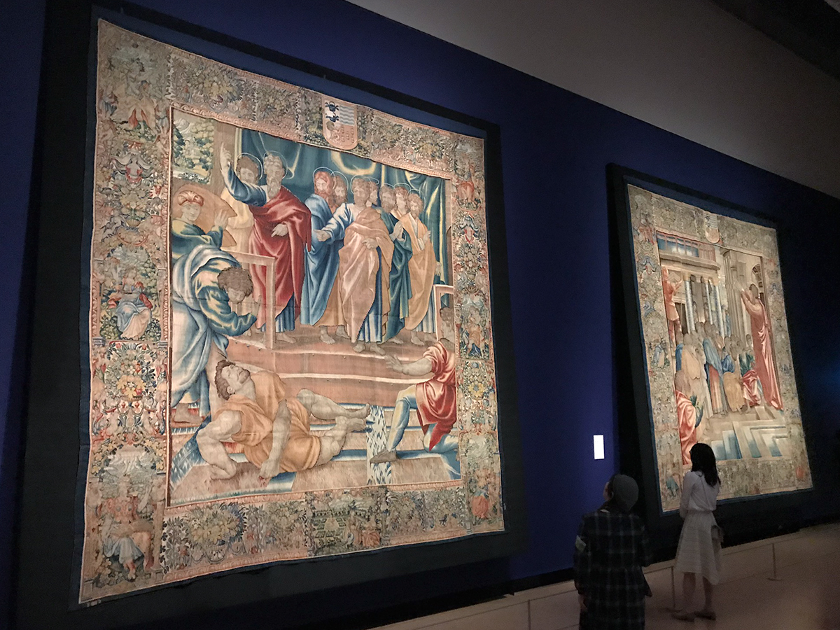(左手前から)ラファエロ・サンツィオ(カルトン)、ヤーコブ・フーベルス(父)の工房(織成)《アナニアの死》、連作〈聖ペテロと聖パウロの生涯〉より ブリュッセル 1600年頃 / ラファエロ・サンツィオ(カルトン)、ヤーコブ・フーベルス(父)の工房(織成)《アテネにおける聖パウロの説教》、連作〈聖ペテロと聖パウロの生涯〉より ブリュッセル 1600年頃 ともにウィーン美術史美術館
