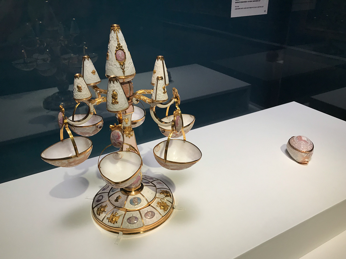 (左から)《シャーベット用センターピース》ウィーン、1736-40年 / 《神聖ローマ皇帝フランツ1世とマリア・テレジアの肖像が描かれた小箱》ウィーン?、18世紀半ば ともにウィーン美術史美術館