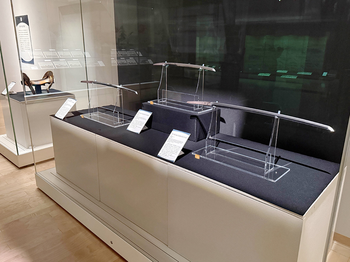 会場を進むと、甲冑師の一大門流である明珍派の具足が並びます。明珍宗保による《紺糸素懸威五枚胴具足》は、紺糸で板札をつなぎ、菊花文の金具を細やかに施しています。