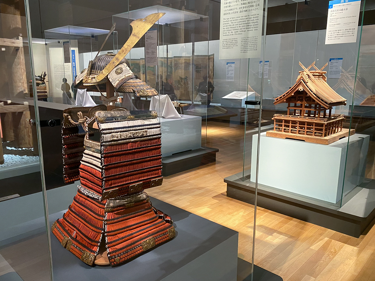 (左手前から)重要文化財《赤糸威肩白鎧》室町時代 15~16世紀 島根・出雲大社 [展示期間:1/15~2/9] / 《出雲大社本殿木形》江戸時代 寛文4年(1664)頃 島根・出雲大社