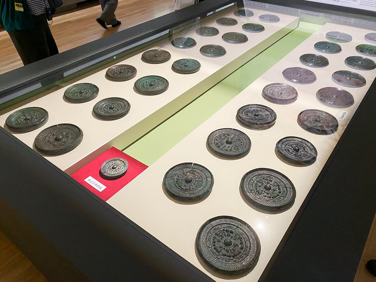(赤い床の上)重要文化財《黒塚古墳出土品のうち 画文帯神獣鏡》奈良県天理市 黒塚古墳出土 古墳時代・3世紀 文化庁(奈良県立橿原考古学研究所保管) / (他すべて)重要文化財《黒塚古墳出土品のうち 三角縁神獣鏡》奈良県天理市 黒塚古墳出土 古墳時代・3世紀 文化庁(奈良県立橿原考古学研究所保管)