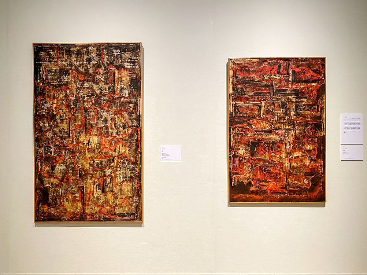 独特の質感を持つ《鳥たちの壁A》は、下村良之助(1923-1998)の作品。紙粘土を画面に盛り上げてレリーフ状にし、化石のような表情をつくっています。下村は舞台美術、陶器、挿絵など、多方面で活躍しました。