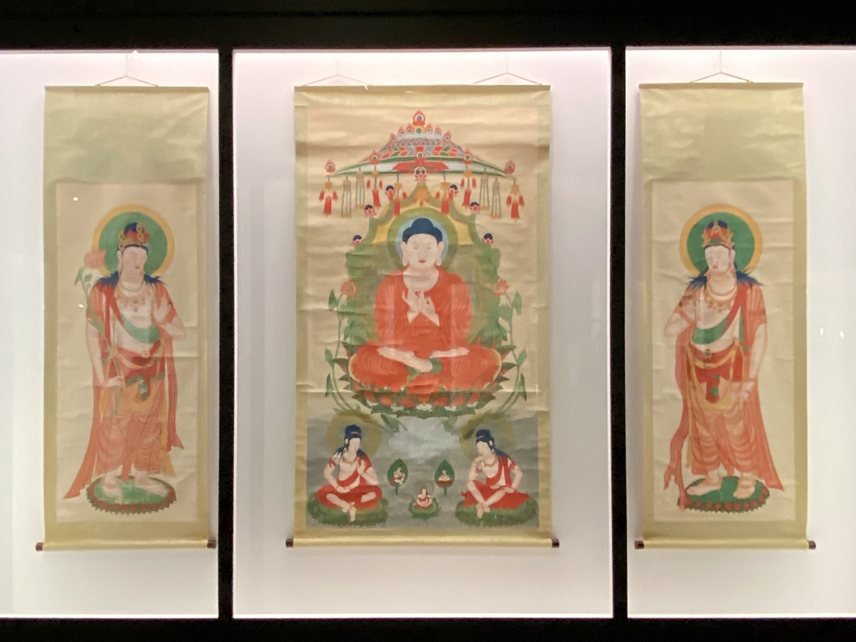 《阿弥陀浄土図》祐参筆 1852 山梨・放光寺 (左から)勢至菩薩像、阿弥陀如来像、観音菩薩像[全期間展示]