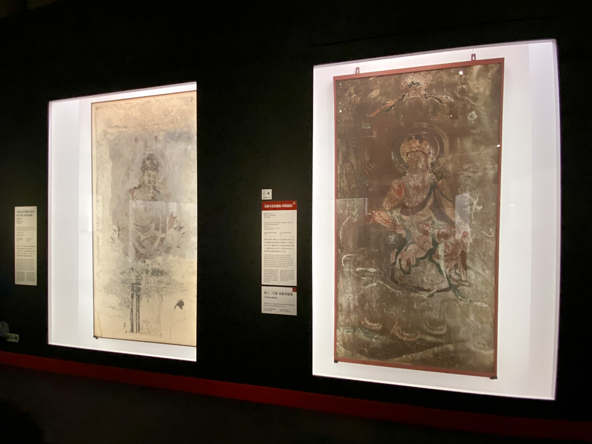 (左から)法隆寺金堂壁画(模本)より《第十一号壁 普賢菩薩像 部分、第八号壁 文殊菩薩像 部分》 / 法隆寺金堂壁画(模本)より《第二号壁 菩薩半跏像 部分、第十号壁 薬師浄土図 部分、第一号壁 釈迦浄土図 部分》鈴木空如模 大正~昭和時代 20世紀 東京国立博物館[ともに全期間展示]