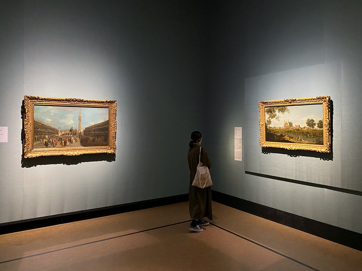 (左から)フランチェスコ・グアルディ《ヴェネツィア:サン・マルコ広場》1760年頃 / カナレット(本名ジョヴァンニ・アントニオ・カナル)《イートン・カレッジ》1754年頃