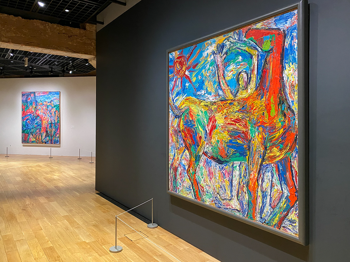 (左奥)神田日勝《人間 B》1969年 神田日勝記念美術館 / (右手前)神田日勝《晴れた日の風景》1968年 神田日勝記念美術館