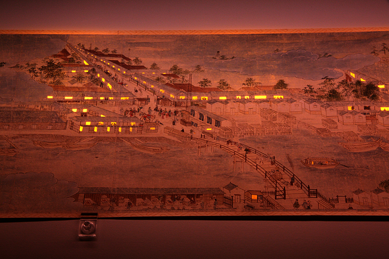 注目されるのは、この絵巻に「影からくり絵」の細工が施されていること。裏側から灯を当てると、舟の提灯や家の窓などに光がともったように見えます。絵巻にこのような細工がされているのは極めて珍しいことです。