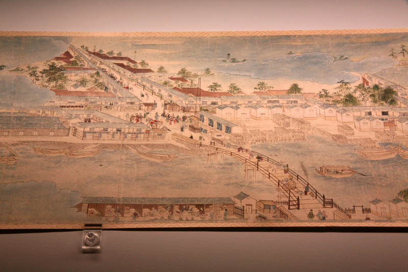 展示の目玉のひとつが、18世紀中頃に制作された《隅田川風物図巻》。約10メートルに及ぶ長大な絵巻に、日本橋をはじめとしたさまざまな橋や河岸の建物、舟遊びの様子などが描かれています。