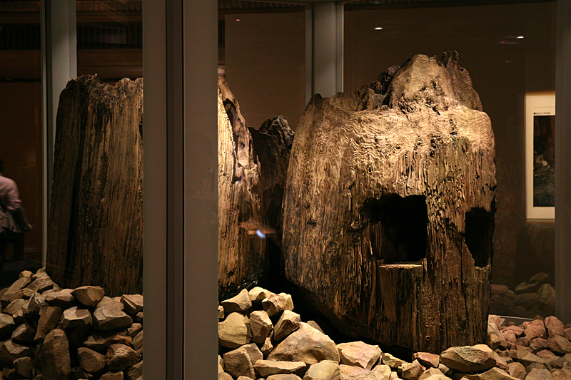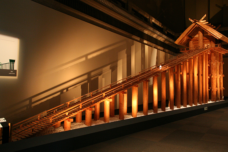 出雲大社復元模型。10世紀頃の想定で、総高を約48メートルとした。10分の1模型