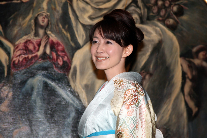展覧会サポーターの森口瑤子さんは、報道内覧会に和服で登場