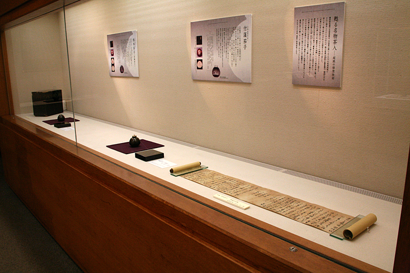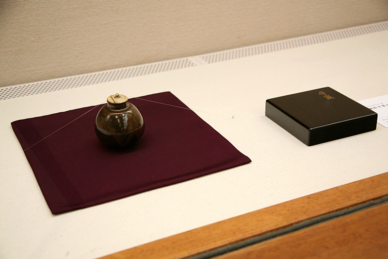 他にも名品茶道具が目白押し。茶入≪付藻茄子≫(つくもなす:九十九髪茄子)は、松永久秀が織田信長に献上し、代わりに一国一城を安堵された大名物。本能寺の変や大阪夏の陣で被災してバラバラになりましたが、徳川家康の命により超絶技法で修復されました。彌之助が最初に購入した茶道具のひとつです。