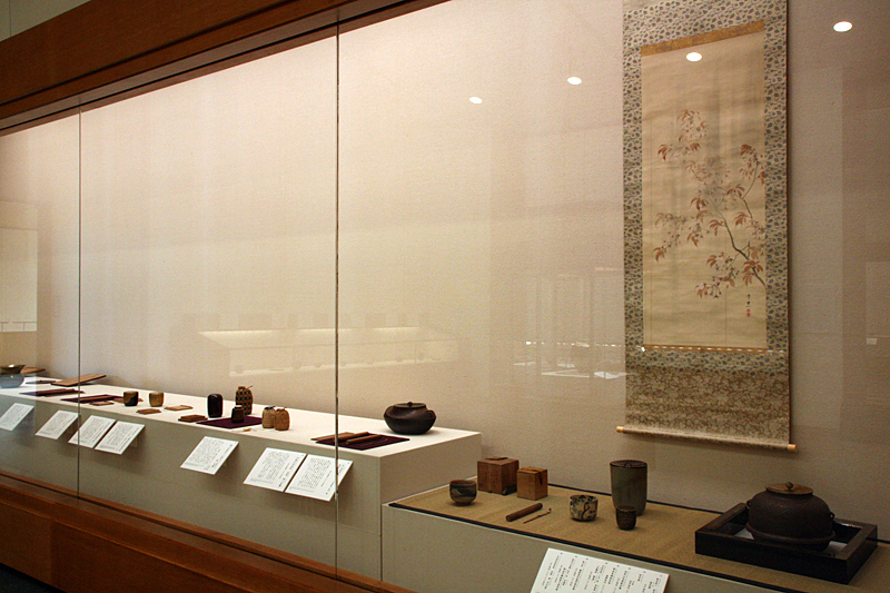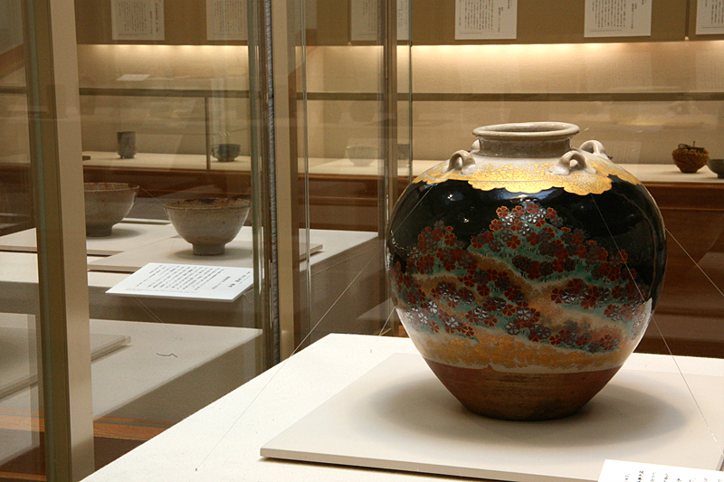 重要文化財≪色絵吉野山図 茶壺≫は、京焼の名工、野々村仁清(ののむらにんせい)の代表作。ちょうど根津美術館でも紹介されている、小堀遠州や松平不昧ゆかりの茶道具も並びます。