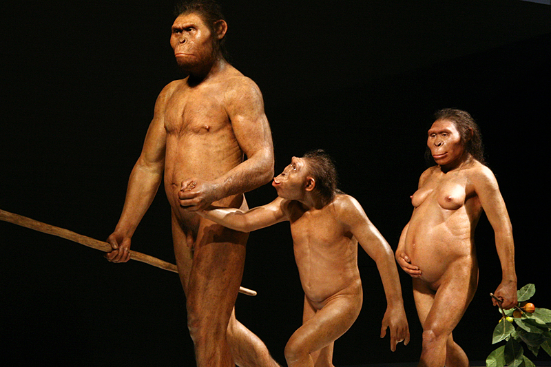 足跡化石から復元された猿人の家族。表情制作のモデルは、ナインティナインの岡村隆史さん。300枚以上の表情写真を撮影しました