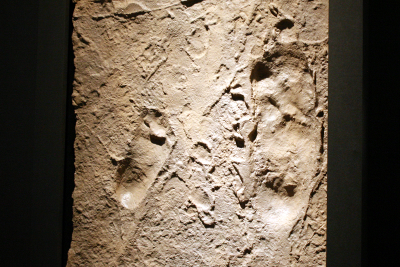 ラエトリの足跡化石のレプリカ。右側の足跡は2人分重なっています。