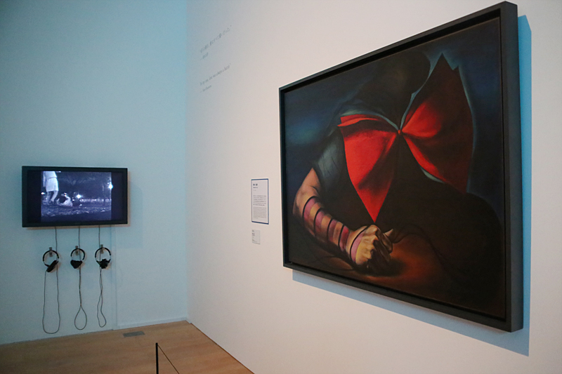 岡本太郎《痛ましき腕》1936/1949(右)の奥のビデオ作品は、TANY《昔の男に捧げる》2002年。実生活に基づいたフィクションで、元恋人だったアーティストの会田誠が女(TANY)に無抵抗のまま殴られ続ける。BGMには五輪真弓「恋人よ」が流れる