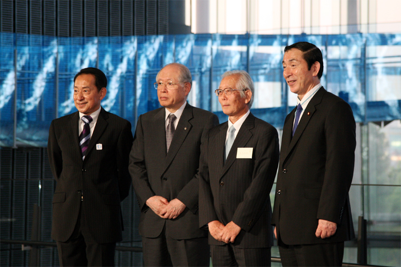 左から毛利館長、野依氏、白川氏、髙木大臣